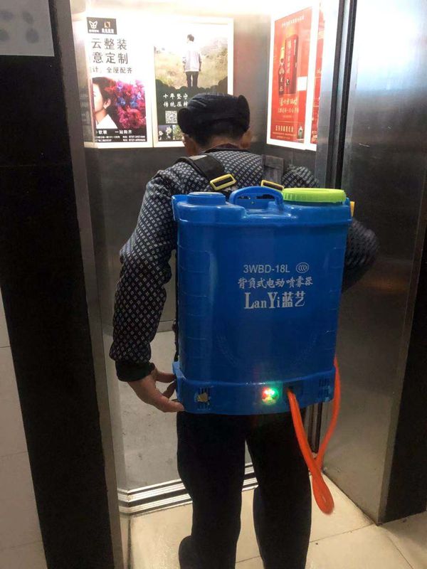 圖為物業(yè)公司給小區(qū)電梯進行消毒