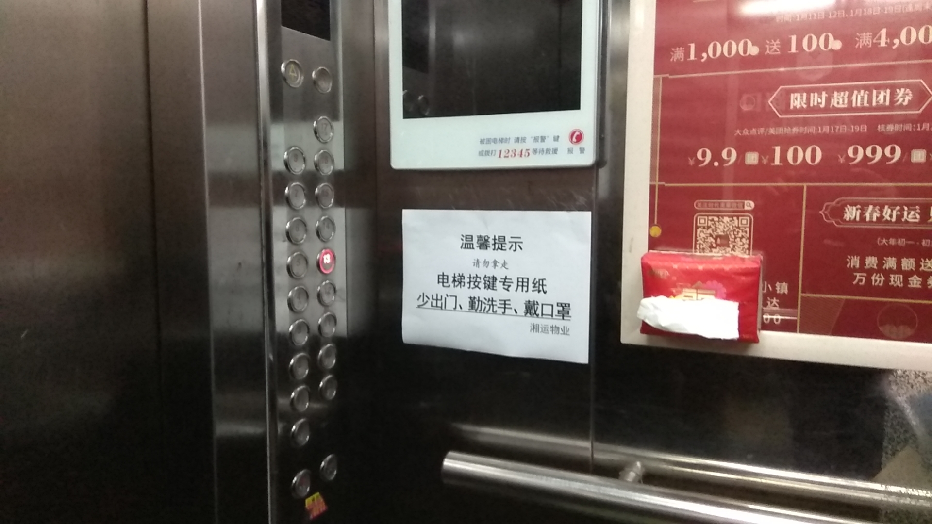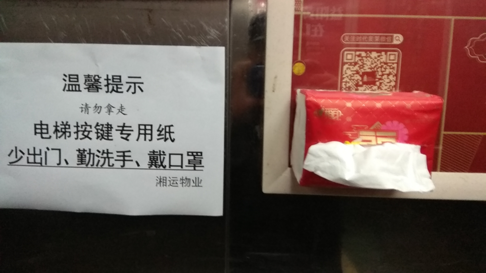2月1日,在益陽市桃花里小區(qū)的電梯里,出現(xiàn)了一張醒目的“溫馨提示”A4紙,旁邊安放了一盒抽紙巾。這是湘運物業(yè)服務(wù)管理公司細心防控疫情的有力措施。根據(jù)電梯空間小、封閉嚴,一旦有病毒極易被感染的情況,公司經(jīng)理袁笑當天一早就安排值班人員采購、準備好了相關(guān)物資,并第一時間落實到位。截止當天12:00,桃花里小區(qū)21臺電梯里都有了如圖所示的便民抽紙。