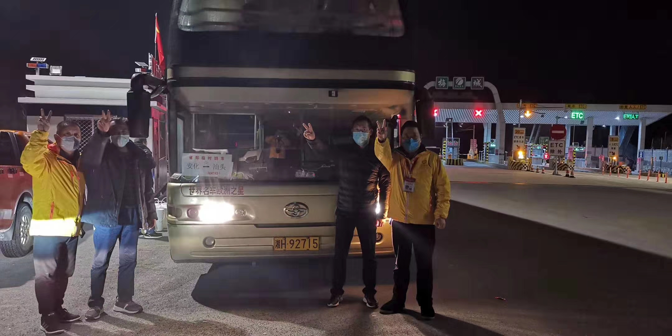 湘H92715是安化運(yùn)輸分公司安化至汕頭的承包車輛。2月12日,身在廣東的班線車隊(duì)隊(duì)長(zhǎng)黃勇軍獲悉,因?yàn)榭箵粢咔榘不h梅城鎮(zhèn)醫(yī)院消毒液等物資緊缺,急需一批消毒液;廣東博羅縣有400斤消毒液要送回家鄉(xiāng)梅城鎮(zhèn)正苦尋托運(yùn)途徑。黃勇軍立即和車隊(duì)人員商量,決定班車?yán)@道500公里,送貨到高速公路梅城收費(fèi)站。于是,車隊(duì)積極與捐贈(zèng)消毒液的愛(ài)心老板取得了聯(lián)系,將400斤消毒液放上了回程的班車。12日早上8點(diǎn),班車從汕頭出發(fā),一路順風(fēng),于13日6點(diǎn)左右抵達(dá)梅城收費(fèi)站。湘H92715將消毒液交給了提前聯(lián)系好、在收費(fèi)站等候的梅城鎮(zhèn)志愿者們。當(dāng)志愿工作人員提出給付運(yùn)費(fèi)時(shí),黃勇軍等車隊(duì)人員異口同聲:不要!醫(yī)院抗擊疫情這么辛苦,這點(diǎn)小忙應(yīng)該幫的!