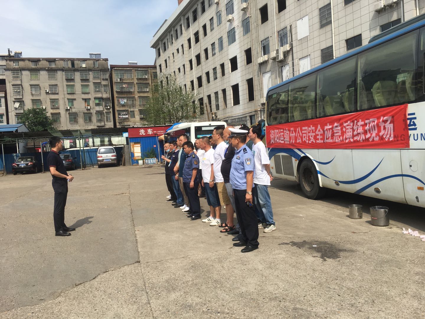 6月16日15點(diǎn)30分,資陽站務(wù)分公司聯(lián)合城區(qū)承包線、益銀巴士公司及資陽區(qū)交通局、資陽區(qū)道路運(yùn)輸服務(wù)中心在車輛進(jìn)站口下客區(qū)開展安全應(yīng)急演練,共24人參加。在資陽區(qū)道路運(yùn)輸中心主任楊與強(qiáng)調(diào)本次應(yīng)急演練的注意事項(xiàng)及重要性后,宣布演練開始。