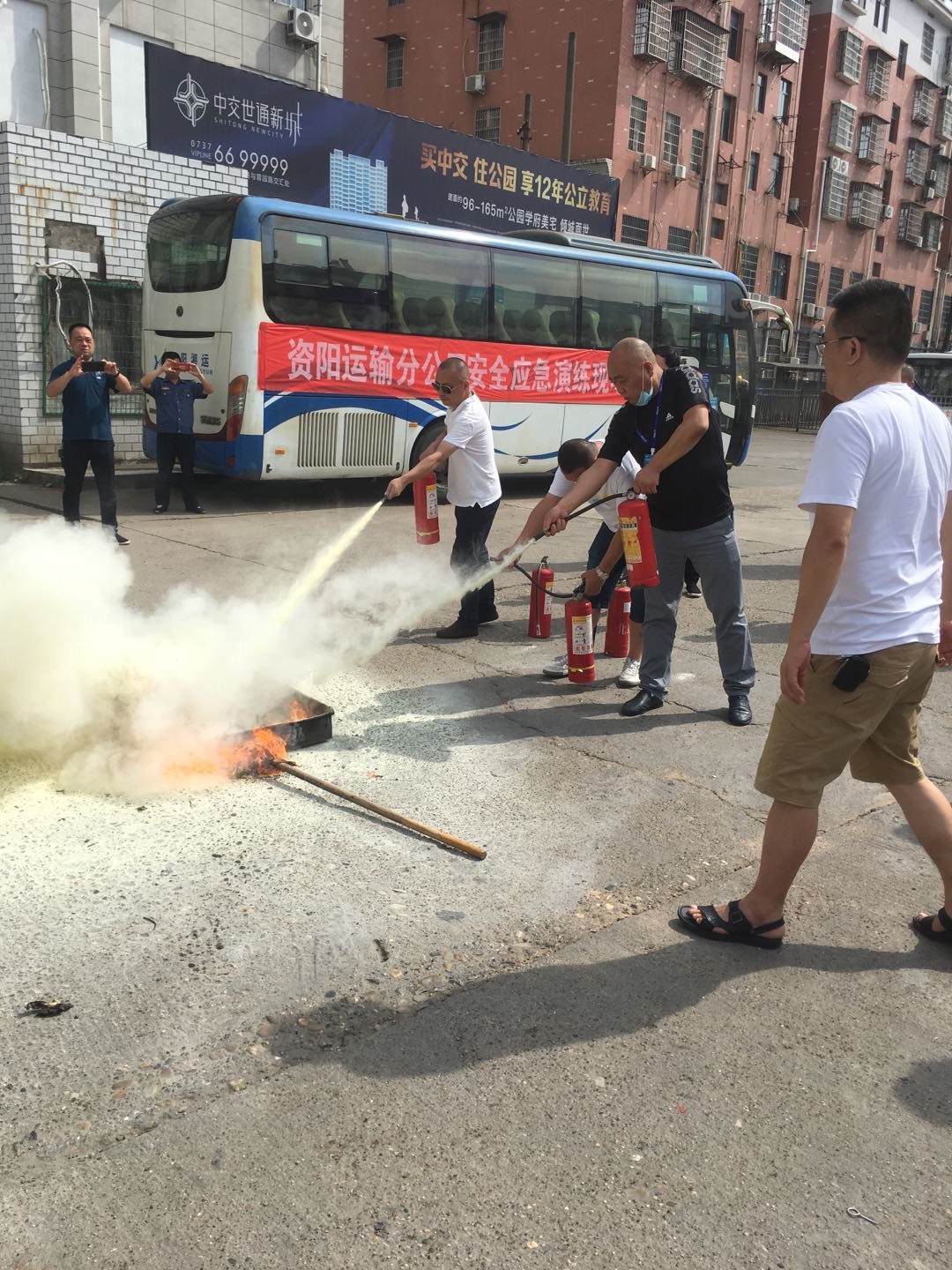 演練模擬長沙回益陽的車輛在下客區(qū)下客時(shí),行李倉冒煙自燃,駕駛員第一時(shí)間撥打“119”報(bào)警并報(bào)告給應(yīng)急演練領(lǐng)導(dǎo)小組,總指揮張軍、李益平在接到報(bào)告后第一時(shí)間趕到現(xiàn)場(chǎng),指揮應(yīng)急小組成員有效疏散旅客,隨后在交通、運(yùn)管和119的大力協(xié)助下,旅客得以疏散逃生,大火得以撲滅。